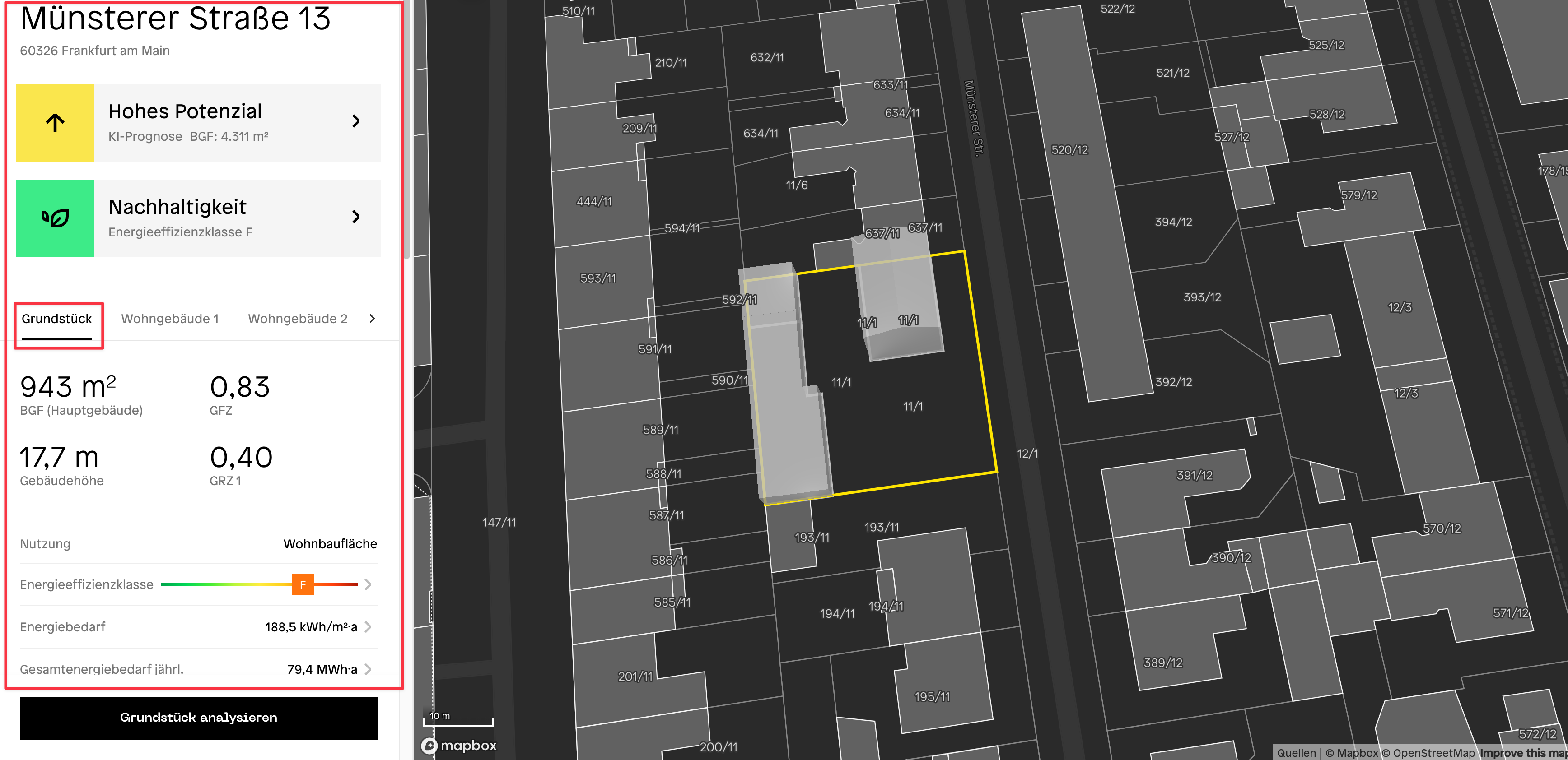 Die einzelnen Grundstücksdaten und Gebäudeinformationen (von der Bruttogeschossfläche bis zur Flurstücksnummer) können in der Seitenleiste abgerufen werden.