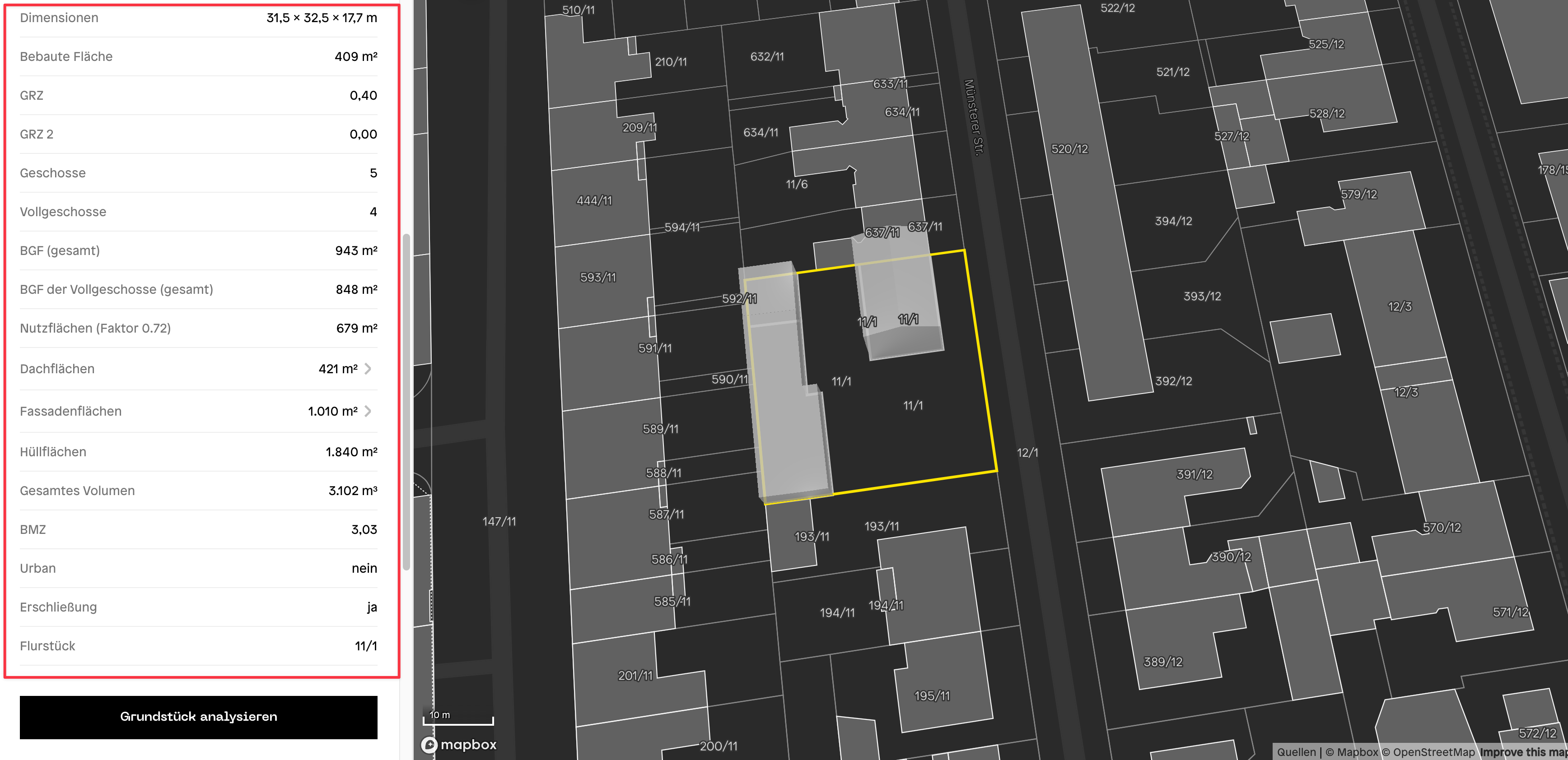 Nach Eingabe Ihrer Wunschadresse wird Ihnen eine umfassende Ansicht präsentiert. Auf der linken Seite finden Sie detaillierte Informationen sowohl zum Grundstück als auch zu den darauf befindlichen Gebäuden. Zunächst erhalten Sie allgemeine Angaben zum Grundstück, darunter die Bruttogeschossfläche (BGF), die Grundflächenzahl (GRZ), die Geschossflächenzahl (GFZ) und die Gebäudehöhe. Beim Scrollen nach unten haben Sie die Möglichkeit, zusätzliche Details wie Grundstücksfläche, Bebaute Fläche, Anzahl der Geschosse, Volumen, das Alter des Flurstücks sowie die Flurstücksnummer und die Gemeinde als Überblick zu erhalten.