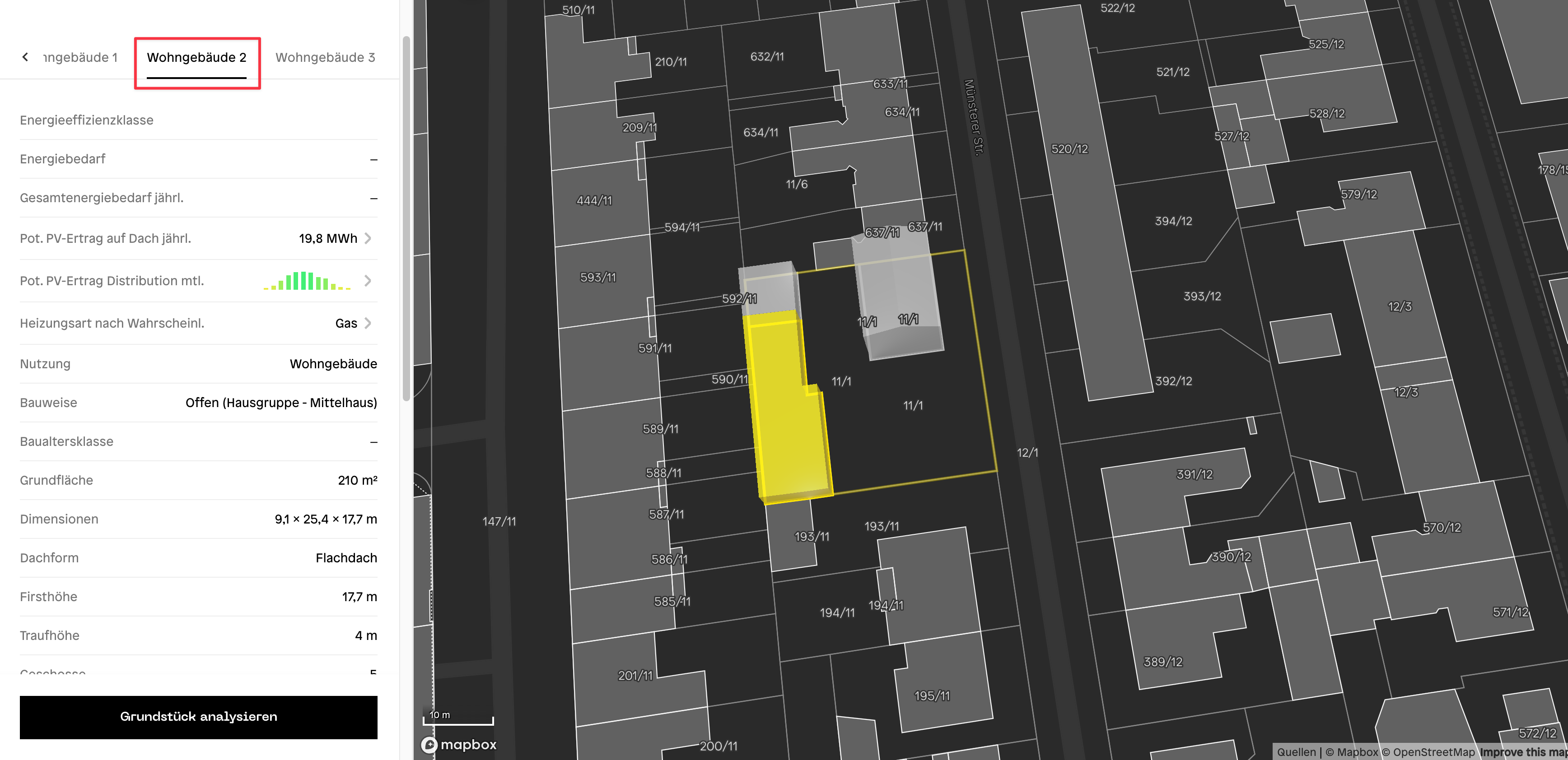 Zusätzlich bietet unsere Plattform die Möglichkeit, Informationen über einzelne Gebäudeteile auf dem Grundstück abzurufen. Hierbei erhalten Sie dieselben Details wie zuvor erwähnt, jedoch speziell auf den jeweiligen Gebäudeteil bezogen. Neben Angaben zur Bruttogeschossfläche (BGF), Geschosshöhe und Volumen erfahren Sie außerdem, wie der aktuelle Nutzungszustand des jeweiligen Gebäudeteils ist.
