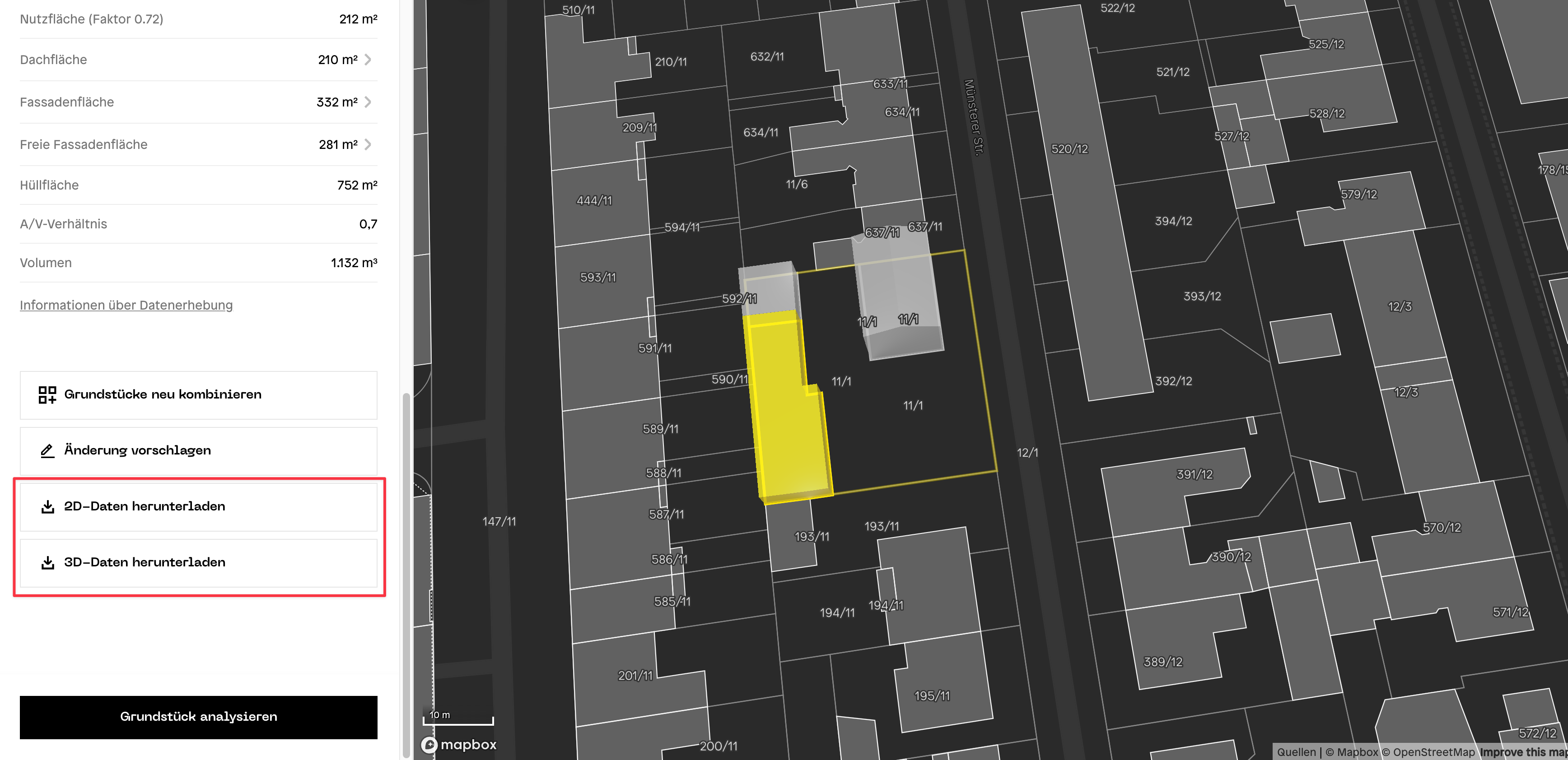 Die Vektordaten, darunter Grundstücksumriss, Gebäude im Kartenausschnitt, Flurstücke und mehr, stehen Ihnen zum Download als 2D- oder 3D-Daten zur Verfügung.