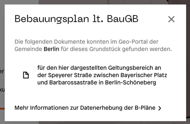 Nach der Auswahl eines Grundstücks in syte, können die gefundenen B-Plan Dokumente entweder über die Legende in dem Karten-Layer, oder über die Seitenleiste heruntergeladen werden: