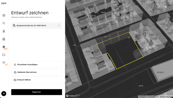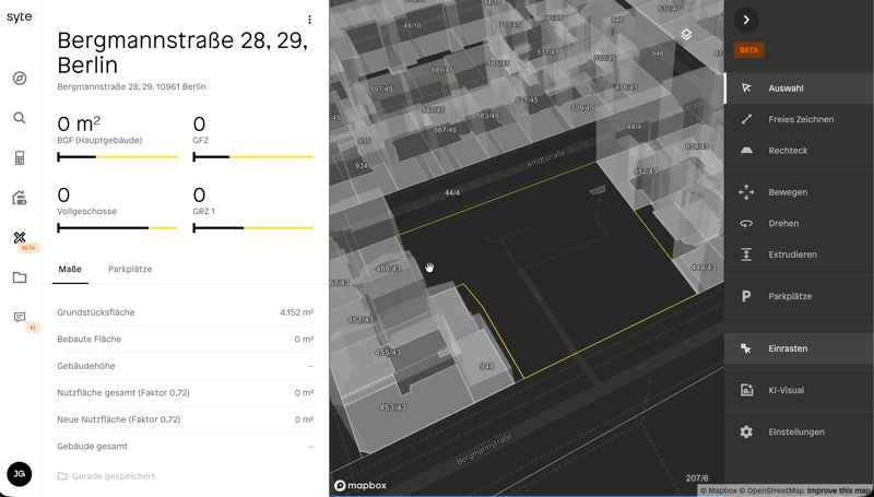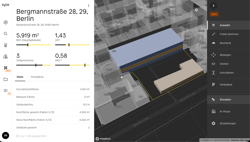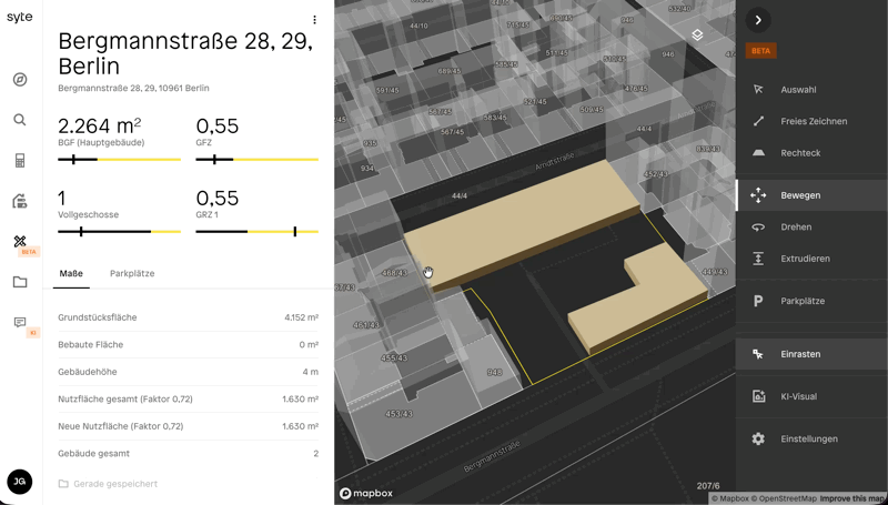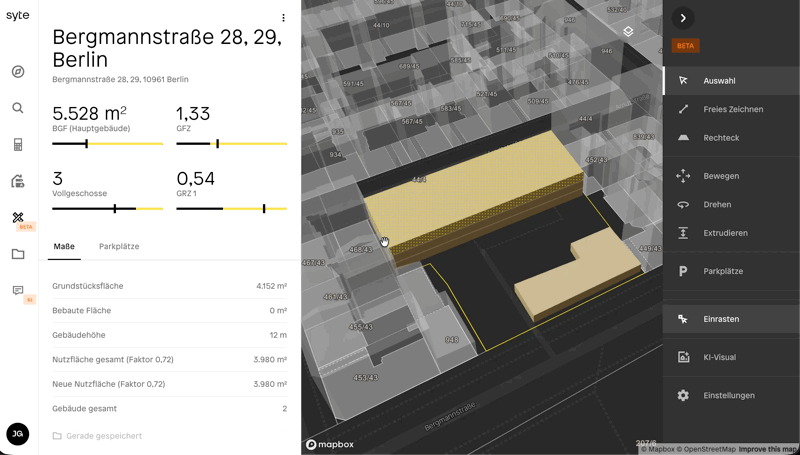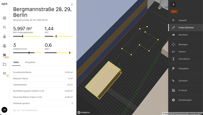 Mit dem Entwurfswerkzeug in syte können Nutzer eigene 3D-Entwürfe für Bauprojekte erstellen. Der Entwurf basiert auf realen Grundstücken und Bestandsgebäuden und ermöglicht es, neue Baukörper zu zeichnen, Kennzahlen zu prüfen und Varianten zu entwickeln.