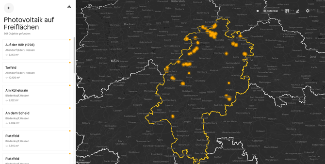 Innerhalb weniger Sekunden erhalten Nutzer eine Liste potenzieller PV-Standorte
